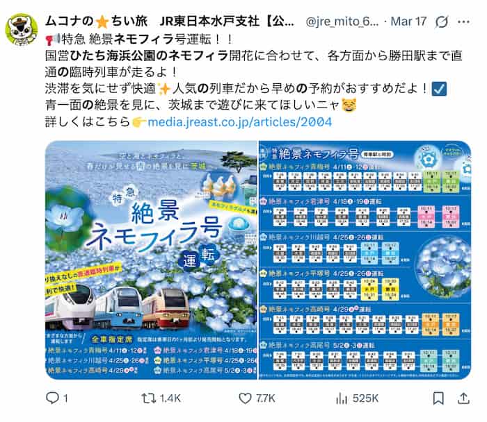 ちなみに、JR東日本は2026年春もネモフィラ観賞向けの記事を公開していて、臨時特急「絶景ネモフィラ号」の案内も出しています。