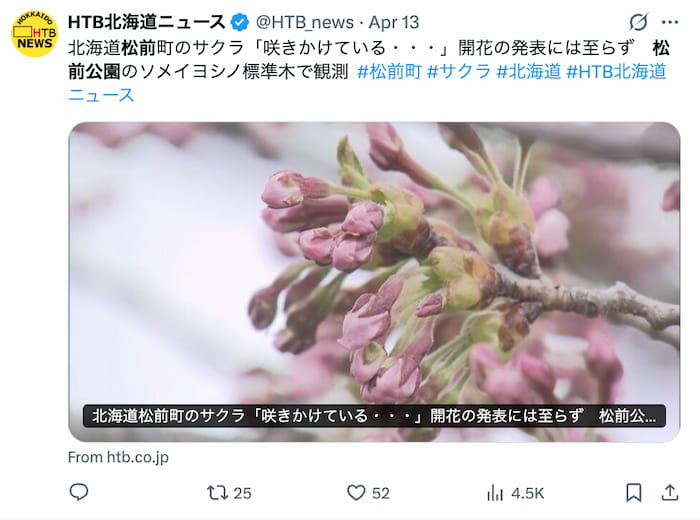 ただ、松前町の公式発表では、標準木のソメイヨシノは4月13日15時に開花確認済みです。